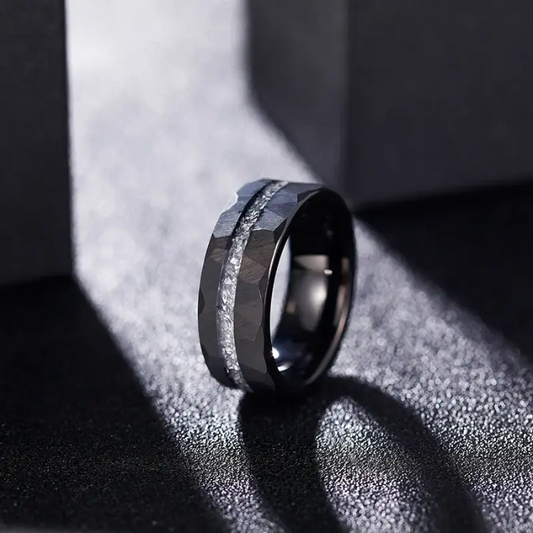 Black Hammered Tungsten Carbide Ring with Meteorite Inlay